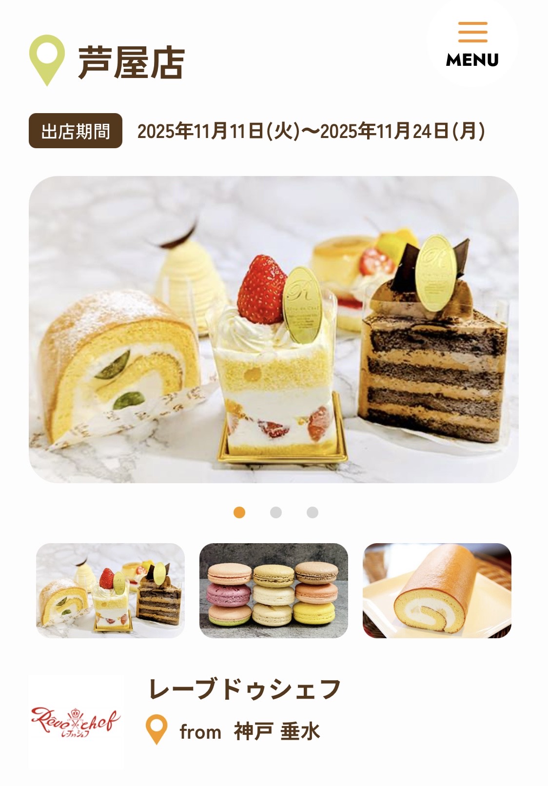 レーブドゥシェフでは、季節ごとの厳選された素材を、一番おいしく お楽しみいただけるように、旬のフルーツやテーマに合わせ、期間や 数量を限定したスイーツをご用意しています。 四季折々の特別な味わいや、風味を楽しめる季節のスイーツを ぜひお楽しみください。