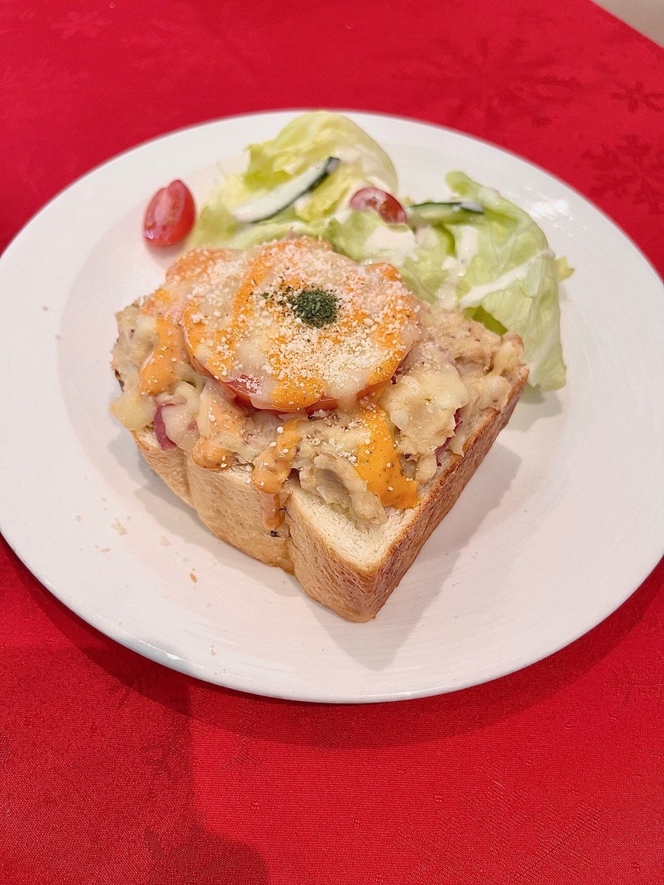 しめじ、トマト、チーズと特製ポテトサラダを軽い食感が魅力のバターリッチパンにのせてこんがりと焼き上げました♪チーズの香ばしさが食欲をそそります!